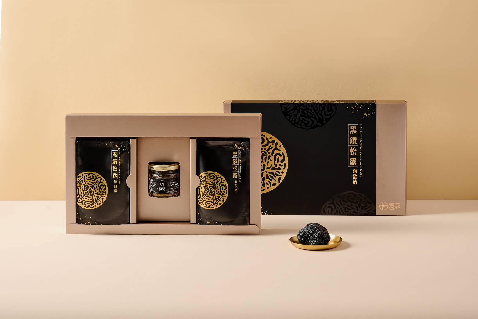 無論是追求品味還是健康,芳茲「黑鑽松露滴雞精」都是絕佳的保養聖品;從年節送禮考量,芳茲「黑鑽松露滴雞精」禮盒中除了有6包頂級版滴雞精──「黑鑽松露滴雞精」(50ml / 包 ),還有一瓶「夏季黑松露10%醬」與一只特別設計的高質感金色湯匙,無論送給重視養生的長輩、擁有挑剔味蕾的美食家朋友、懷孕中或產後的孕婦閨蜜,還是喜歡黑松露迷人風味的高品味客戶…這組黑金雙色高質感禮盒,必然會讓收禮者一致給予滿分五顆星最高好評!