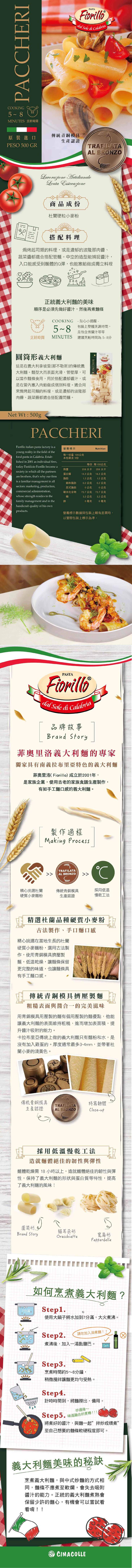 此麵形狀為義大利拿坡里的傳統麵形,形狀粗如筒狀,管壁厚,適合搭配濃郁的醬汁,或者是塞入肉餡做成料理。如焗烤起司、波隆那肉醬、蔬菜醬都適合搭配。